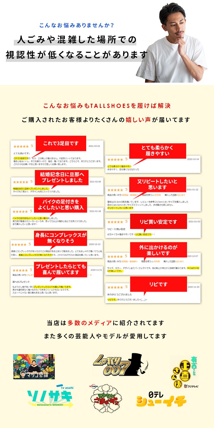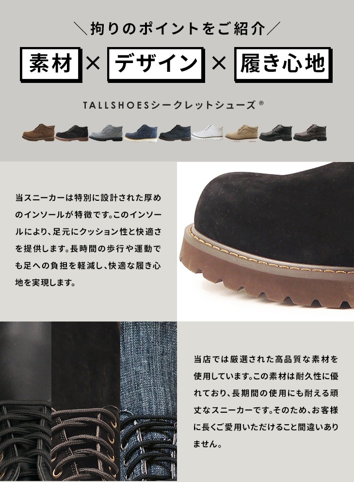 背が高くなる靴専門店トールシューズの一押し商品、当店人気NO.1のシークレットスニーカー。 インヒール構造で外見からは厚底に見えず、シークレット(秘密・密か)に身長が盛れる!バレずに8cm身長アップできるヒールアップシューズです。低身長でお悩みの方・身長コンプレックスの方におすすめです。